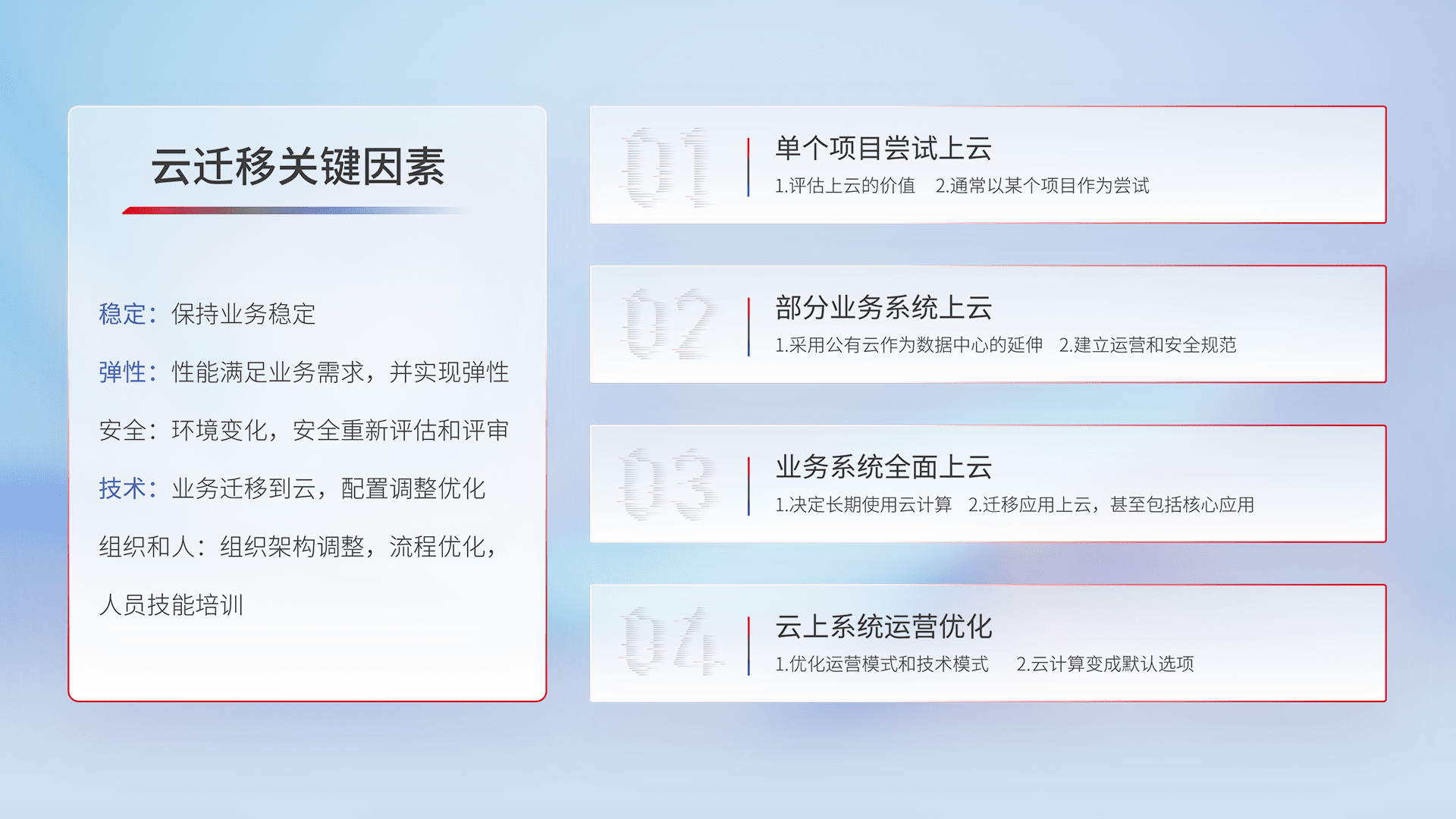 结合实际业务,,从规划设计、、云平台选型、、、、云原生改造、、数据迁移、、、、集成交付,,迁移全过程为客户识别最佳上云路径,,,,做好风险识别管理,,,,设计网络架构、、、、身份权限、、安全审计合规、、操作审计、、、、日志审计、、监控告警策略、、、、多站点容灾设计等,,,,对云上基础设施进行整体规划,,提升IT治理水平,,,,以满足弹性、、、高可用、、、高性能的需求。。。